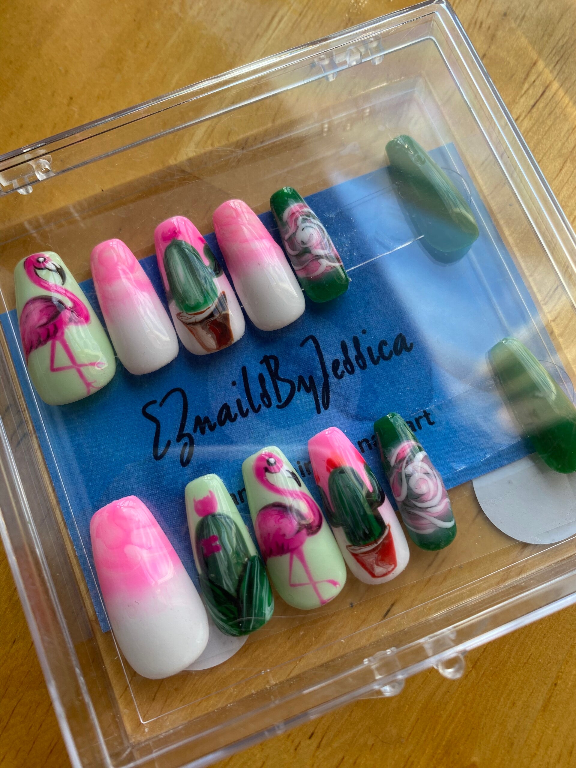 These beautiful flamingo nails are a size small, coffin shape. The beautiful pink ombré rose is the perfect scent to the light mint greens. Enjoy these unique show stopping nails!