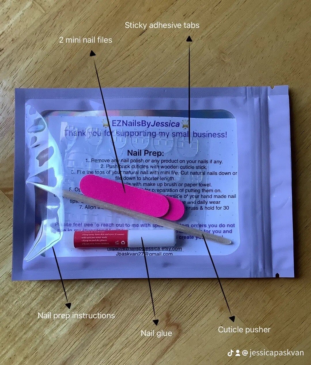 All press on nails come with your free nail prep kit that includes everything for your long lastin press ons. With proper prep you nails will last you over two week!